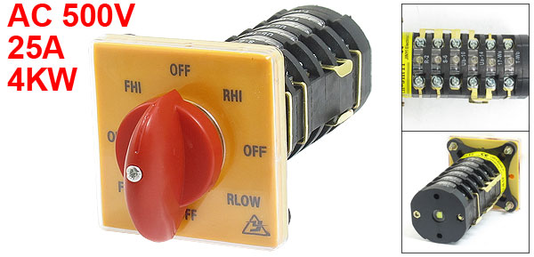 Product Name Changeover Switch Model No. JYW25-6 R0786 Action Type Latching Ui AC 500V Ith 25A Power 4KW Ue AC 80V 12A Ui DC 220V 0.27A Positions 8(OFF-FHI-OFF-RHI-OFF-RLOW-OFF-FLOW) Terminal Number 24 Thread Hole Distance 46mm/ 1.81"(Center to Center) Thread Hole Diameter 4.4mm/ 0.17" Body Diameter 40mm/ 1.5" Overall Size 60x 60 x 120mm / 2.36" x 2.36" x 4.72"(L*W*H) External Material Plastic Net Weight 287g Package Content 1 x Changeover Switch