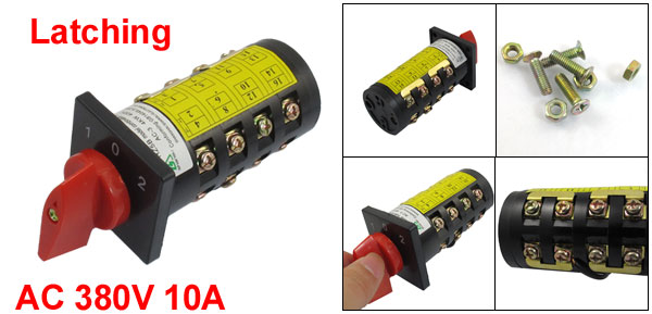 DetailsLatching Locking 3 Position 1-0-2 AC 380V 10A Cam Combination Changeover Switch  Product Name Changeover Switch Model No. HZ5B-10/M08.4 Action Type Latching Ui AC 380V Ith 10A AC-3 400V 4KW Positions 3(1-0-2) Terminal Number 16 Screw Size 14 x 3.8mm/ 0.55" x 0.15"(L*Dia) Thread Hole Distance 36mm/ 1.42"(Center to Center) Thread Hole Diameter 4.8mm/ 0.19" Body Diameter 42mm/ 1.65" Overall Size 50x 50 x 118mm / 1.97" x 1.97" x 4.65"(L*W*H) External Material Plastic Net Weight 218g Package Content 1 x Changeover Switch 4 x Pcs Screws