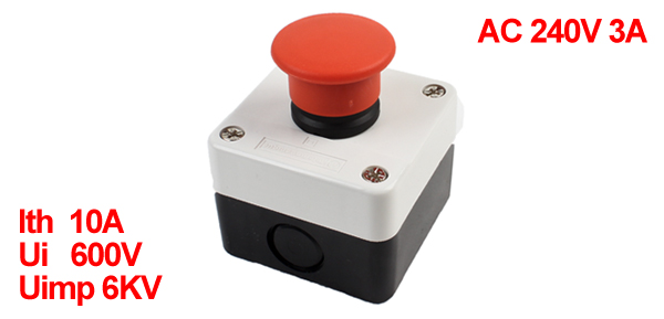 Product Name Push Button Switch Action Type Latching Contact Type Normal Close Working Voltage Current AC 240V 3A Ith 10A Ui 600V Uimp 6KV Push Button Diameter 4cm/1.57" Overall Size 6.8 x 6.8 x 5cm/2.67" x 2.67" x 2"(L*W*H) Shell Material Plastic Color Black, White, Red Net Weight 126g Package Content 1 x Push Button Switch  - Reviews