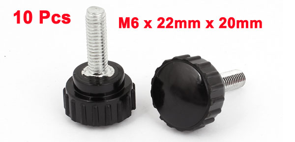Product Name Knurled Knob Type Screw On Head Diameter 22mm /0.9" Male Thread Length 20mm /0.8" Male Thread Diameter M6 Total Height 33mm/ 1.3" Material Metal , Plastic Color Silver Tone, Black Net Weight 85g Package Content 10 x Knurled Knobs - Reviews