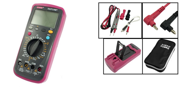 Product Name Digital Multimeter AC Voltage(V) 200V, 750V DC Voltage (V) 200mV, 2V, 20V, 200V, 1000V DC Current (A) 200mA, 20A Resistance (Ohm) 200, 2k, 20k, 200k, 2M, 20M Power By 9V 6F22 Battery (not included) Color Fuchsia, Black Mateiral Plastic & Metal Test Leads Total Length 90cm/ 35" Multimeter Size 19.6 x 9.5 x 5cm/ 7.7" x 3.7" x 2" (L*W*T) Net Weight 400g Package Content 1 x Multimeter - Reviews