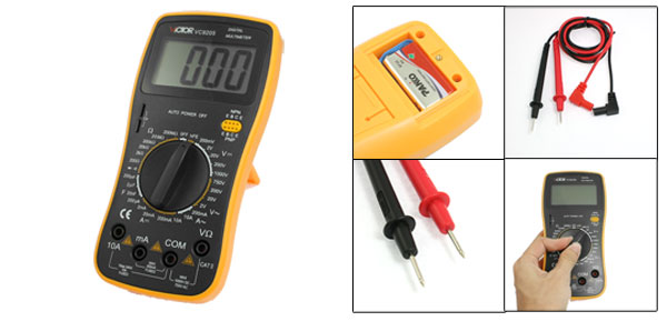 DetailsLCD Display Ohmmeter AC DC Testing VC9205 Digital Mulitmeter  Product Name Digital Multimeter AC Voltage (V) 2, 20, 200, 750 DC Voltage (V) 200m, 2, 20, 200,1000 AC Current (A) 200m, 10 DC Current (A) 200u, 2m, 20m, 200m, 10 Resistance (Ohm) 200, 2k, 20k, 200k, 20M, 200M Capacitance (F) 20n, 2u, 200u Other Measuring Function Diode, hFE, Main Color Black & Yellow Mateiral Plastic & Metal Test Leads Total Length ~85cm/ 33" Multimeter Size 17.5 x 8.5 x 3cm/ 6.9" x 3.3" x 1.2" (L*W*T) Net Weight 238g Package Content 1 x Digital Multimeter