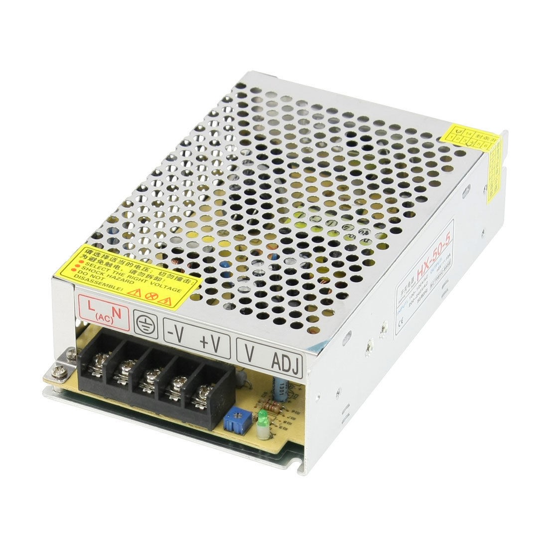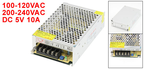 Item Name Switching Power Supply Model No. HX-50W-5V Power Type Constant Voltage Input 100-120VAC 200-240VAC 50/60Hz Output DC 5V 10A Power 50W Size 16 x 9.5 x 4.5cm / 6.3" x 3.7" x 1.8" (L*W*H) Case Material Metal, Aluminum Alloy Main Color Silver Tone Net Weight 376g Package Content 1 x Switching Power Supply - Reviews