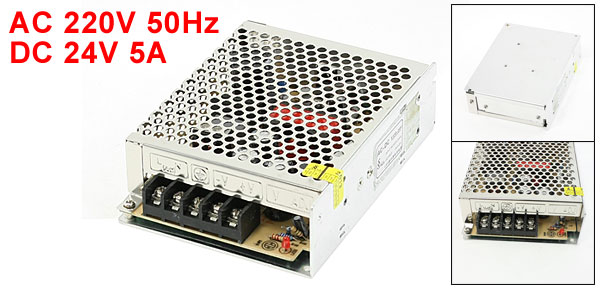 Item Name Switching Power Supply Model No. S120-24V Power Type Constant Voltage Input AC 220V 50Hz Output DC 24V 5A Power 120W Size 13 x 9.7 x 3.8cm / 5.1" x 3.8" x 1.5" (L*W*H) Case Material Metal, Aluminum Alloy Main Color Silver Tone Net Weight 374g Package Content 1 x Switching Power Supply - Reviews