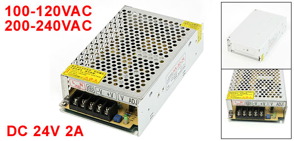 DetailsLED Strip Light Switching Power Supply Adapter 48W 100-120VAC DC24V 2A  Item Name Switching Power Supply Model No. HX-50-24 Power Type Constant Voltage Input 100-120VAC 200-240VAC 50/60Hz Output DC 24V 2A Power 48W Size 16 x 9.5 x 4.5cm / 6.3" x 3.7" x 1.8" (L*W*H) Case Material Metal, Aluminum Alloy Main Color Silver Tone Net Weight 378g Package Content 1 x Switching Power Supply