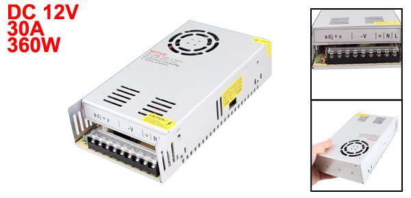 DetailsLED Strip Light Switching Power Supply Adapter AC 110/220V DC 12V 30A 360W  Item Name Switching Power Supply Model No. S-350-12 Power Type Constant Voltage Input AC 110/220V± 15% Output DC 12V, 30A DC Output Power 360W Size 21.5 x 11.5 x 5.2cm/ 8.5" x 4.5" x 2" (L*W*T) Case Material Metal Main Color Silver Tone Net Weight 796g Package Content 1 x Switching Power Supply