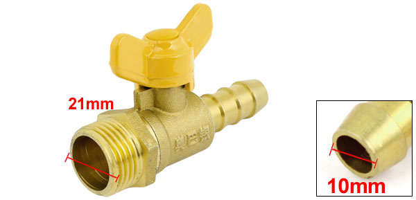 Product Name Gas Ball Valve Male Thread Diameter 21mm/1/2"PT Hose Tail Outside Diameter 10mm Level Handle Size 41 x 17mm/1.6"x 0.67"(L*W) Overall Size 66 x 25mm/2.6"x 1"(L*Max.D) Color Gold Tone, Yellow Material Brass, Metal Weight 81g Package 1 x Ball Valve - Reviews