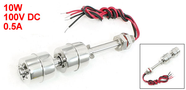 Product Name Floating Switch Model No. ZS12010-2 Max Contact Rating 10W Max Switching Voltage 100V DC Max Switching Current 0.5A Max Breakdown Voltage 220V DC Max Carry Current 1A Max Contact Resistance 100mΩ Max Temperature -30°C - +120°C Material Stainless Steel, SUS304 Thread Dia(Approx) 10mm / 0.39" Thread Length 15mm / 0.59" Switch Length (Thread Length Excluded) 120mm / 4.7" Cable Length 34cm / 13.4" Color Silver Tone Net Weight 64g Package Content 2 x Floating Switch - Reviews