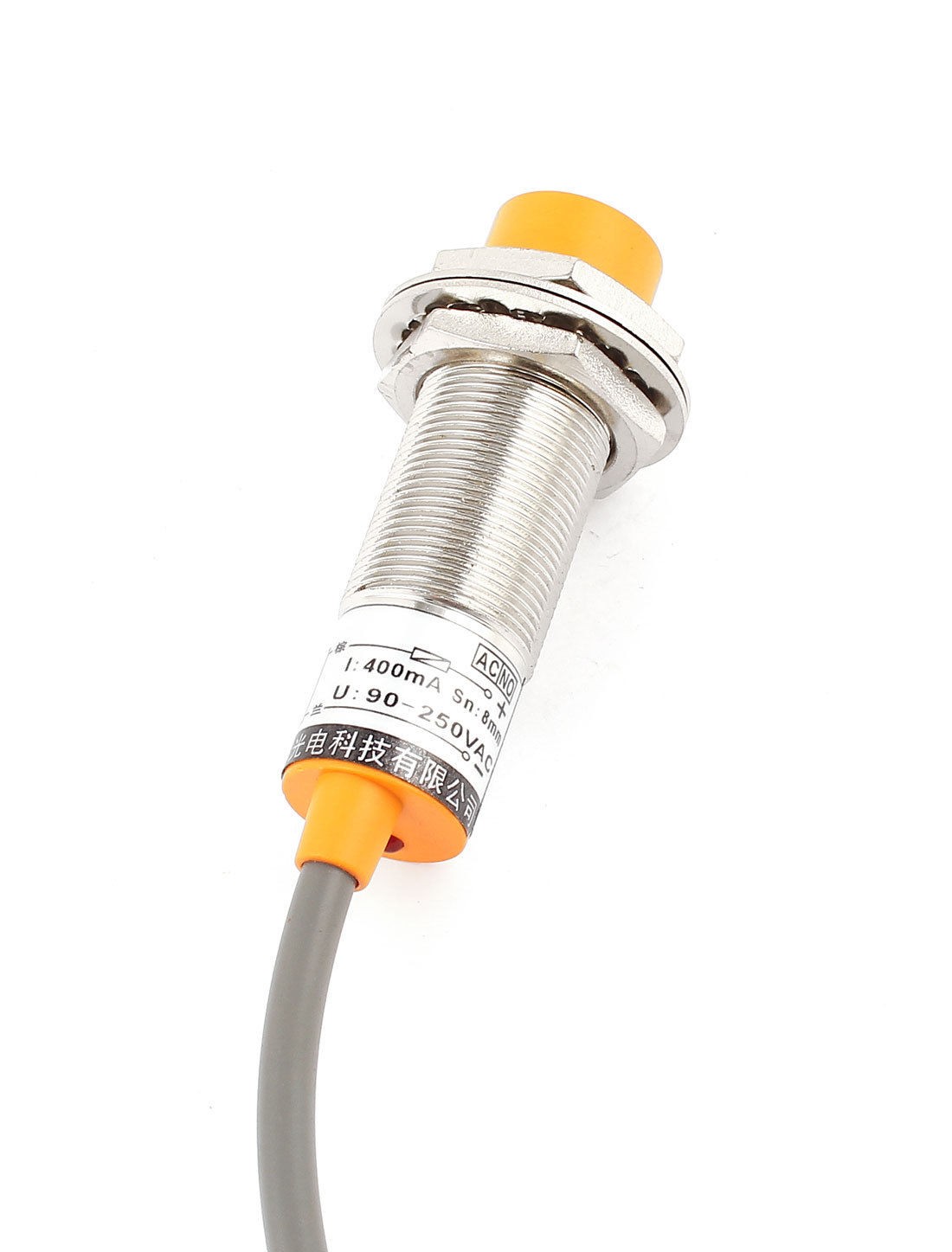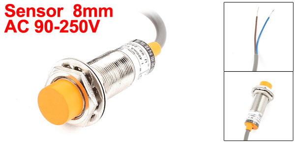 DetailsLJ18A3-8-J/EZ Normal Open 8mm 2-Wire Inductive Sensor Proximity Switch  Product Name Proximity Switch Model LJ18A3-8-J/EZ Theory Inductive Sensor Wire Type 2 Wire Type (Brown, Blue) Switch Appearance Type Cylinder Type, Metal Shell Output Type NO(Normal Open) Sensor Distance 8mm Supply Voltage AC 90-250V Output Current(Max) 400 mA Detect Object Iron Column Sensor Diameter 16mm/0.63" Thread Diameter 18mm/0.7" Total Size 60 x 18mm/ 2.4" x 0.7" (L*D) Cable Length 1m/3.3ft External Material Plastic, Metal Color Silver Tone, Yellow, Gray Net Weight 85g Package Content 1 x Proximity Switch