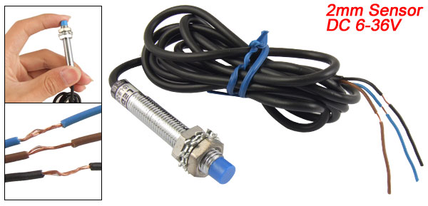 DetailsLJ8-2-Z/BX DC 6-36V NPN 3-wire 2mm Cylindrical Inductive Proximity Sensor Switch  Product Name Inductive Proximity Switch Model LJ8-2-Z/BX Theory Inductive Type Sensor Wire Type 3 Wire Type (Brown, Black, Blue) Switch Appearance Type Cylinder Type, Metal Shell Output Type NPN, NO Detecting Distance 2mm/0.1'' Supply Voltage DC 6-36V Current Output 300mA Detect Object Iron Column Sensor Dia. 8mm/0.3'' Total Size 51 x 15mm/2'' x 0.6'' (L*Max.D) Cable Length 1.1M/43.3'' External Material Plastic, Metal Net Weight 27g Color Silver Tone, Blue, Black Package Content 1 x Inductive Proximity Switch