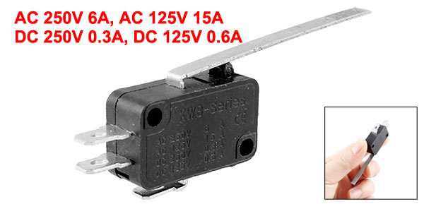 Product Name Micro Switch Model KW8 Actuator Type Long Hinge Roller Lever Type 1NO, 1NC (SPDT) Voltage Rating AC 250V 6A, AC 125V 15A