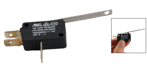 Product Name Micro Switch Model No. LXW-16-1-3 Actuator Type Long Straight Hinge Lever Rating 16A 1/2HP 125/250V AC 0.6A 125VDC; 0.3A 250VDC Contact configuration SPDT Switch Body Size ~2.8 x 1 x 1.6cm / 1.1" x 0.39" x 0.63"(L*W*H) Fixing Holes Dia. ~0.3cm / 0.118“ Button Height ~0.2cm / 0.08" Actuator Size ~4.8 x 0.44cm / 1.88" x 0.17"(L*W) Terminal Blade Width ~0.62cm / 0.244" Material Plastic & Metal Color Black & Silver Tone Net Weight 8g Package Content 1 x Micro Switch - Reviews