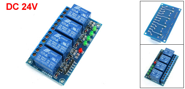 Product Name Relay Module Model SRD-24VDC-SL-C Number of Channels 4 Coil Voltage 24V DC Contact Capacity 10A, AC 250V/125V, DC 30V/28V Size 7.3 x 4 x 2cm/2.9" x 1.6" x 0.78"(L*W*H) Material PCB Color Blue Weight 64g Package 1 x Relay Module - Reviews