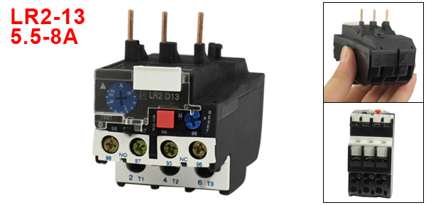 Product Name Thermal Overload Relay w Socket Model LR2-13 Contact Type 1NO 1NC Phase 3 Ui 660V ith 5A Tripping Class 10A Adjustable Current Range 5.5-8A Thermal Relay Rated Current 8A DC-13 Ue:220 V Ie:0.2 A AC-15 Ue V 220 380 Ie A 2.73 1.58 Total Size (Approx.) 43 x 50 x 88mm/ 1.7" x 2" x 3.5" (L*W*H) Material Plastic, Electronic Components Color Black, White Net Weight 154g Package Content 1 x Thermal Overload Relay w Socket - Reviews