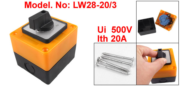 Product Name Changeover Cam Switch Model. No LW28-20/3 Control Type On - Off - On Positions Quantity 3 Terminals Quantity 12 Ui 500V Ith 20A Handle Size 3.5 x 1cm / 1.37" x 0.4"(L*W) Overall Size 7.1 x 7.7 x 9cm / 2.8" x 3" x 3.5"(L*W*H) Mateiral Plastic & Electronics Color Black & Yellow Net Weight 195g Package 1 x Changeover Cam Switch - Reviews