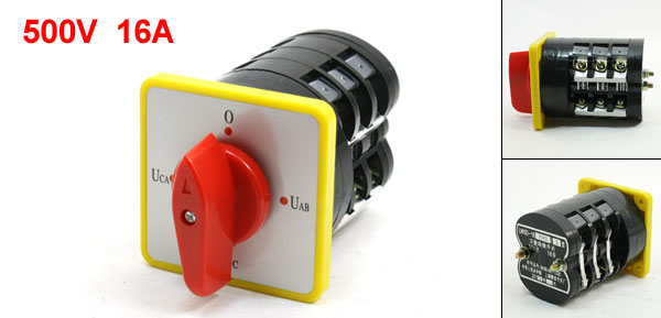 Product Name Cam Switch Model No. LW5D-16 YH3/3 Rating 500V 16A Positions 4 Positions Terminal Number 12 Body Size 70 x 56 x 80mm / 2.8" x 2.2"x 3.1"(L*W*H) Panel Size 72 x 72 mm/2.8" x 2.8" (L*W) Overall Height 120mm / 4.7" Mount Hole Diameter 4mm/0.16" Mount Hole Center Distance 58mm/2.3"(L and W) External Material Plastic, Metal Color Red, Black Net Weight 380g Package Content 1 x Cam Switch