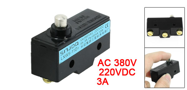 Product Name Limit Switch Model No. LXW5-11D1 Ue AC 380V, 220VDC Ith 3A Pe 100VA, 10W Contact Configuration 1NO,1NC(SPDT) Terminals 3 Screw Terminal Actuator Type Short Push Plunger Switch Body Size 5 x 1.8 x 2.7cm / 1.97 x 0.7 x 1.1"(L*W*H) Fixing Holes Dia. 0.4cm / 0.16“ Distance Between Centers of Fixing Holes 2.5cm / 0.98" Actuator Size Height from Body (open): ~0.8cm / 0.31”