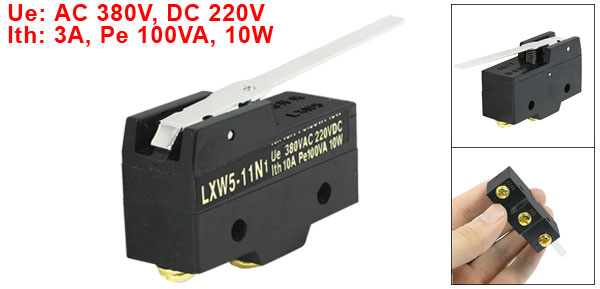 DetailsLXW5-11N1 3A Micro Limit Switch Long Lever Arm SPDT Snap Action CNC new  Product Name Micro Switch Model No. LXW5-11N1 Contact Type 1NO, 1NC, 1 Com Mounting Type Panel Mount Termination Style Screw Terminal Actuator Type Straight Hinge Lever Rating Ue: AC 380V, DC 220V Ith: 3A, Pe 100VA, 10W Switch Body Size 5 x 1.8 x 3cm / 1.97" x 0.7" x 1.2"(L*W*H) Fixing Holes Dia. 0.4cm / 0.16" Distance Between Centers of Fixing Holes 2.5cm / 0.98" Roller Lever Size 7 x 0.8cm/ 2.7" x 0.3" (L*W) Color Black, Silver Tone Net Weight 30g Package Content 1 x Micro Switch
