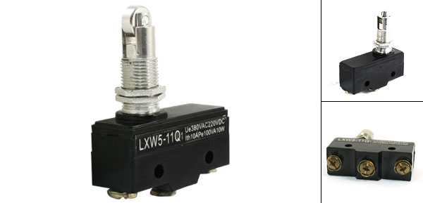 DetailsLXW5-11Q 3 Screw Terminals Panel Mount Roller Plunger Basic Limit Switch  Product Name Limit Switch Model No. LXW5-11Q Mounting Type Panel Mount Contact Configuration 1NO,1NC(SPDT) Terminals Screw Terminal Actuator Type Parallel Roller Plunger Voltage, Current Ue380VAC 220VDC, Ith10A Pe100VA 10W Switch Body Size 5 x 1.8 x 2.2cm / 1.97 x 0.7 x 1"(L*W*H) Fixing Holes Dia. 3.5mm/ 0.14" Distance Between Centers of Fixing Holes 2.5cm / 1" Roller Actuator Size Height from Body: ~3.4cm / 1.34” Roller Dia: 10mm/ 0.4" Thread Dia: 1.1cm/ 0.43" Color Black & Gold Tone Net Weight 42g Package Content 1 x Limit Switch