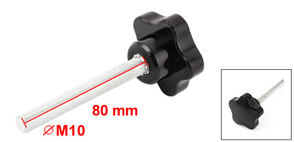 Product Name Star Knob Type Screw Type Head Size 48 x 48 x 14mm / 1.9" x 1.9" x 0.55" (L*W*T) Thread Length 80mm / 3" Thread Diameter M10 / 0.4" Total Length 108mm / 4.25" Material Metal, Plastic Color Silver Tone, Black Net Weight 84g Package Content 1 x Star Knob - Reviews