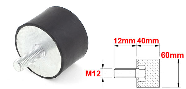 Product Name Rubber Vibration Isolator Male Thread Size M12 x 30mm(Dia.*L) Female Thread Size M12 x 12mm(Dia.*L) Rubber Size 60 x 40mm / 2.4" x 1.6" (Dia.*H) Material Metal, Rubber Color Black, Silver Tone Weight 307g Package Content 1 x Rubber Vibration Isolator - Reviews