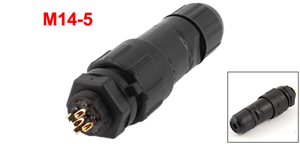 Product Name Waterproof Connector Model M14-5 Degree of Protection IP67 IP68 Rated Current 10A Rated Voltage 500V Cable Dia Max 7mm / 0.28" Total Size 20 x 63mm / 0.79" x 2.5" (D*L) Material Plastic Color Black Net Weight 15g Package Content 1 x Waterproof Connector - Reviews