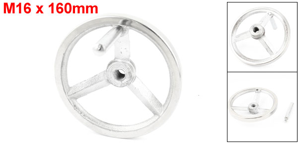 Product Name Hand Wheel Spoke 3 Wheel Diameter 160mm / 6.3" Center Bore Thread Diameter M16/0.63" Wheel Total Height 42mm/1.3" Handle Thread Diameter M10/0.4" Handle Size (Not Included Thread) 14 x 78mm / 0.55" x 3" (Max D * H) Thickness (Approx.) 16mm / 0.63" Materials CastIron Chrome Plated Net Weight 936g Package Content 1 x Handwheel