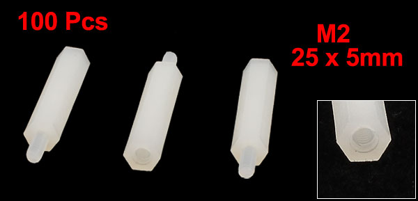 Product Name Hexagonal Threaded Spacer Thread Size M2 Thread Length 5mm / 0.2" Tube Length 20mm / 0.8" Total Size 25 x 5mm / 0.98" x 0.2" (H*D) Material Nylon Color White Net Weight 30g Package Content 100 Pcs (±2%) x Hexagonal Threaded Spacer - Reviews
