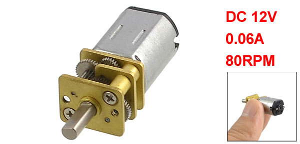M20 Rated Voltage DC 12V Rated Current 0.06A ( no load ) Speed 80RPM Rated Torque 5Kg.cm Shaft Diameter 3mm/ 0.118" Gearbox Size 14 x 12 x 10mm/ 0.55" x 0.47" x 0.39" (L*W*H) Total Length 34mm/ 1.3" Main Color Silver Tone, Gold Tone Material Metal Weight 10g Package 1 x DC Speed Reduce Motor - Reviews