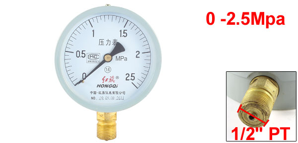 Product Name Pressure Gauge Pressure Intensity 0 -2.5Mpa Accuracy Class Class 1.6 (+/-1.6% fsd) Connector Type 1/2" PT Size 10 x 4.5cm / 3.94" x 1.8" (D*T) Dial Color As Picture Show Exterior Material Metal Net Weight 376g Package 1 x Pressure Gauge - Reviews