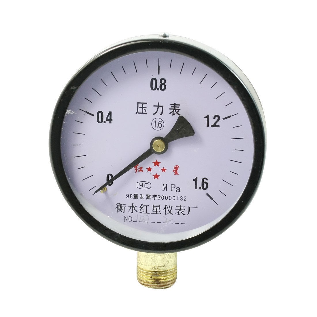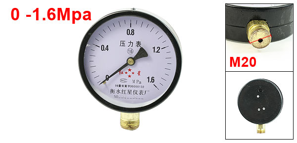 Product Name Pressure Gauge Pressure Intensity 0 -1.6Mpa Accuracy Class 1.6 (+/-1.6% fsd) Connector Type M20x1.5mm Size 9.7 x 4.5cm/ 3.8" x 1.8" (D*T) Dial Color Black Exterior Material Metal Net Weight 245g Package 1 x Pressure Gauge - Reviews