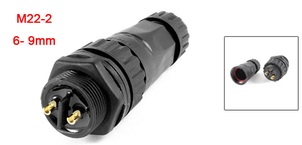 Product Name Waterproof Connector Model M22-2 Degree of Protection IP67 IP68 Cable Range 6- 9mm / 0.24"- 0.35" Total Size 29 x 75mm /1.1" x 3" (D*L) Material Plastic Color Black Net Weight 32g Package Content 1 x Waterproof Connector - Reviews