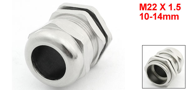Product Name Cable Gland Model M22 Thread Size M22x1.5 Cable Range 10-14mm Thread O.D. 21.3 mm / 0.84" Thread Length 9mm / 0.35" Total Size 31 x 24 mm / 1.2" x 0.95" (L*D) Main Material Stainless Steel Color Silver Tone Weight 40g Package Content 1 x Cable Glands - Reviews