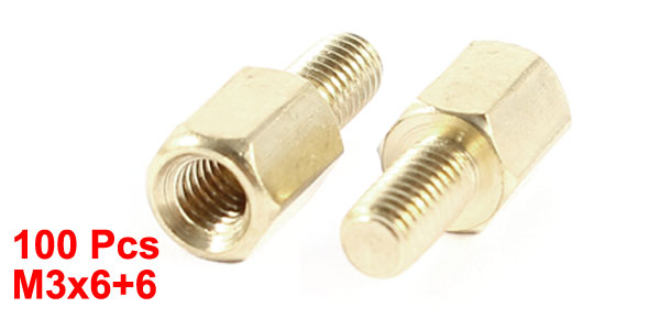 Product Name Standoff Hexagonal Spacer Thread Size M3 Male to Female 6mm+6mm Overall Size(Approx) 12 x 5mm / 0.47" x 0.2" (L*Max.D) Material Brass Color Gold Tone Net Weight 96g Package Content 100 ±2% x Standoff Hexagonal Spacer - Reviews