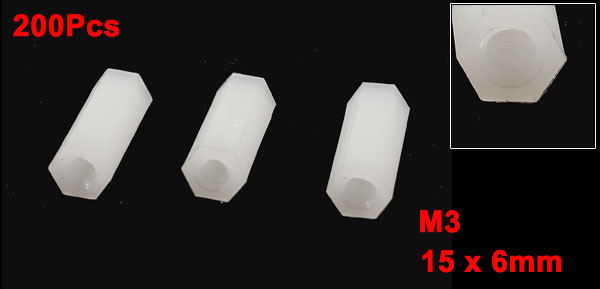 Product Name Hexagonal Threaded Spacer Thread Size M3 Total Size 15 x 6mm / 0.59" x 0.24" (H*D) Material Nylon Color White Net Weight 67g Package Content 200 Pcs (±2%) x Hexagonal Threaded Spacer - Reviews