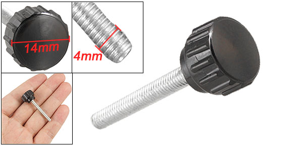Product Name Knurled Knob Type Screw On Head Diameter(Approx) 14mm / 0.551" Thread Pole Length(Approx) 30mm / 1.181" Thread Pole Diameter(Approx) 4mm / 0.157" Overall Height 42mm / 1.653" Material Metal & Plastic Color Silver Tone & Black Weight 6g Package Content 1 x Knurled Knob - Reviews