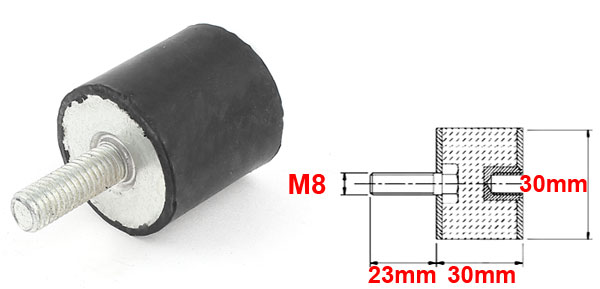 Product Name Rubber Vibration Mount Male Thread Size M8 x 23mm(Dia.*L) Female Thread Size M8 x 10mm(Dia.*L) Rubber Size 30 x 30mm /1.2" x 1.2" (Dia.*H) Material Metal, Rubber Color Black, Silver Tone Weight 63g Package Content 1 x Rubber Vibration Mount - Reviews