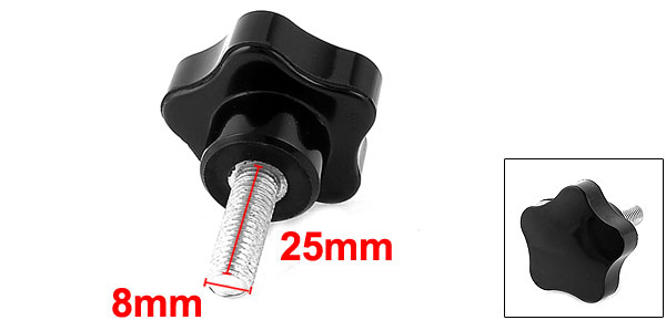 Product Name Star Clamping Knob Type Screw On Head Diameter 40mm / 1.6" Thread Length 25mm / 1" Male Thread Diameter 8mm / 0.3" Total Height 48mm / 1.9" Material Metal & Plastic Color Silver Tone & Black Weight 36g Package Content 1 x Star Clamping Knob - Reviews