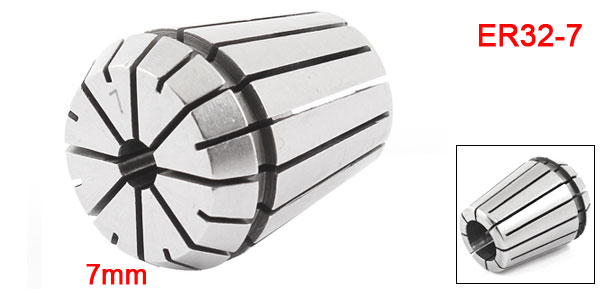 Product Name Spring Collet Model No. ER32-7 Clamping Range 6-7mm/ 0.24"-0.27" Clamping Diameter 7mm/ 0.27" Overall Size 32 x 40mm/ 1.26" x 1.6" (Dia*Length) Material Stainless Steel Color Silver Tone Net Weight 141g Package Content 1 x Spring Collet Chuck - Reviews