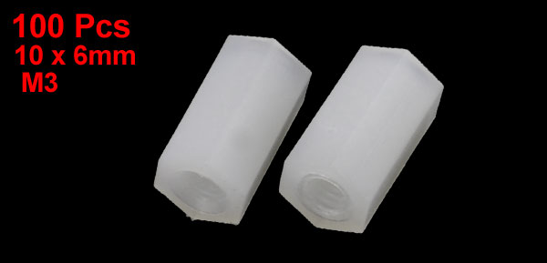 Product Name Hexagonal Threaded Spacer Thread Size M3 Total Size 10 x 6mm / 0.4" x 0.24" (H*D) Material Nylon Color White Net Weight 24g Package Content 100Pcs(± 2%) x Hexagonal Threaded Spacer - Reviews
