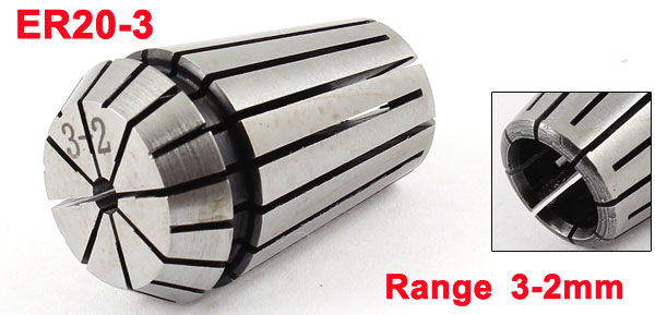 Product Name Spring Collet Model No. ER20-3 Clamping Range 3-2mm/0.12"-0.08" Clamping Diameter 3mm/0.12" Overall Size 20.6 x 31.6mm/0.8" x 1.2"(Dia*Length) Material Stainless Steel Color Silver Tone Net Weight 39g Package Content 1 x Spring Collet Chuck - Reviews