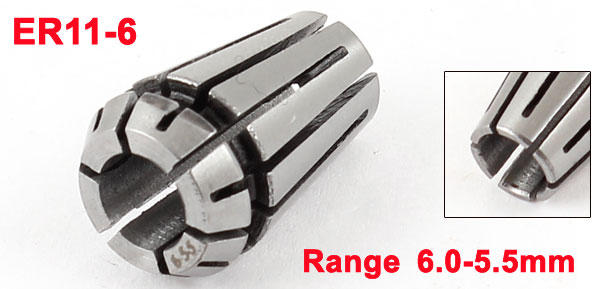 Product Name Spring Collet Model No. ER11-6 Clamping Range 6.0-5.5mm/0.24"-0.22" Clamping Diameter 6mm/0.24" Overall Size 11 x 18mm/0.4" x 0.7"(Dia*Length) Material Stainless Steel Color Silver Tone Net Weight 6g Package Content 1 x Spring Collet Chuck - Reviews