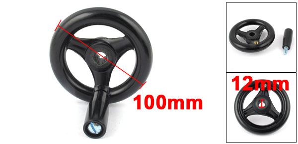 Product Name Hand Wheel Spoke 3 Wheel Diameter 100mm / 4" Center Bore Diameter 12mm/0.47" Wheel Total Height 27mm/1.1" Handle Thread Diameter M8/0.3" Handle Size (Not Included Thread) 20 x 51mm / 0.8" x 2" (Max D * H) Thickness (Approx.) 17mm / 0.67" Materials Bakelite, Metal Net Weight 182g Package Content 1 x Handwheel