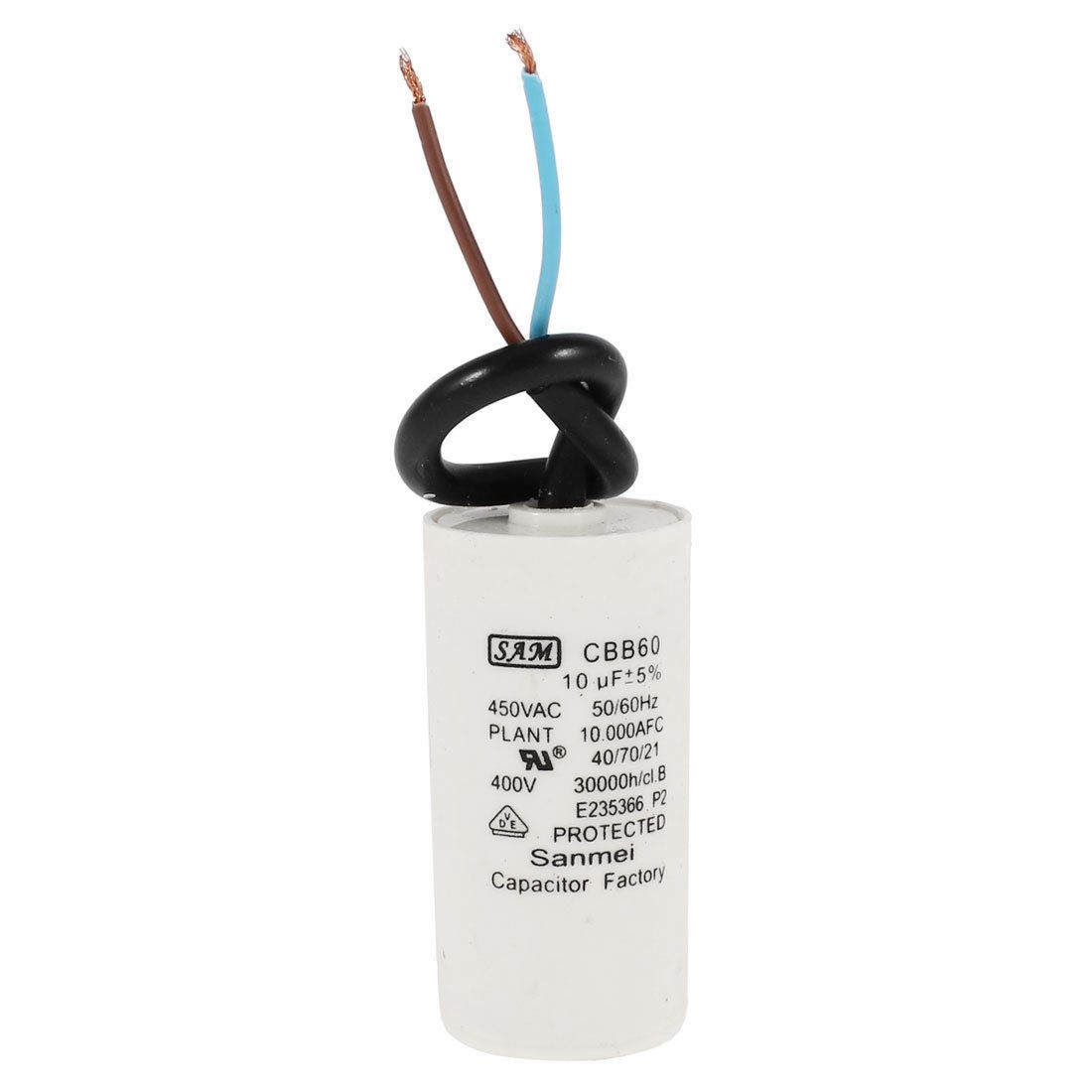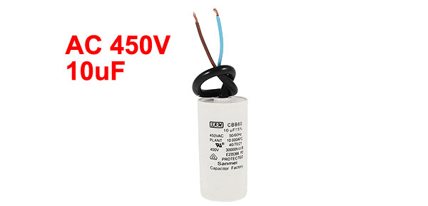 housing Material Plastic Terminal Wire Ambient Temperature 40/70/21 Rated Capacitance 10uF Tolerance ±5% Rated Frequency 50/60Hz Rated Voltage 450V AC Size 3 x 7cm/ 1.2“ x 2.76"(D*H) Wire Length 18cm/ 7.1" Main Color White Net Weight 57g Package Content 1 x Motor Capacitor - Reviews