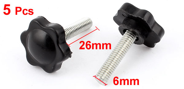 Product Name Star Clamping Knob Type Screw Type Head Size 25 x 25 x 10mm / 1" x 1" x 0.4" (L*W*T) Thread Length 26mm / 1" Thread Diameter 6mm / 0.24" Total Length 37mm / 1.5" Material Metal, Plastic Color Silver Tone, Black Net Weight 47g Package Content 5pcs x Star Clamping Knob - Reviews