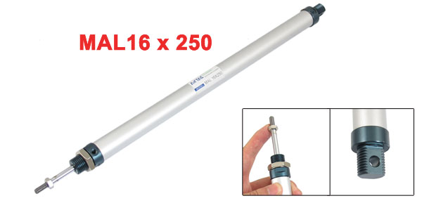 DetailsMAL16x250 16mm Bore 200mm Stroke Sinlge Rod Air Cylinder  Product Name Pneumatic Cylinder Model MAL16 x 250 Action Type Double Acting Rod Type Single Rod Fluid Air Power Pneumatic Bore 16mm / 0.63" Stroke 250mm / 9.8" Max.Pressure 1.0MPa /q 10.2Kg/cm² / 145PSI Port Diameter 4mm / 0.16" Rod Thread Diameter 5.7mm / 0.22" Blue End Thread Diameter 15.5mm / 6.1" Blue End Hole Diameter 6mm / 0.24" Size 350 x 20mm/ 13.8" x 0.8" (L*D) Material Stainless Steel Color Silver Tone, Blue Net Weight 213g Package Content 1 x Pneumatic Cylinder