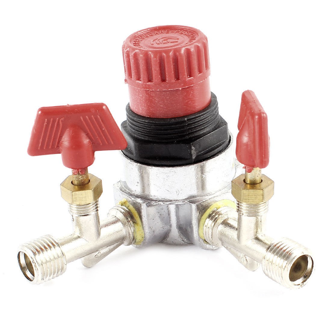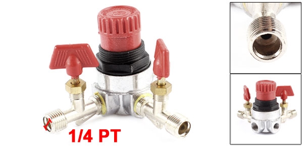 DetailsMale Double Threaded 1/4 PT Pressure Valve Switch for Air Compressor  Product Name Air Compressor Valve Switch Design Double Outlet Material Plastic, Metal Color Red, Black, Silver Tone Male Thread Diameter 13mm/ 1/4 PT Female Thread Diameter Small: 9mm/ 0.35", Big:12mm/ 0.47" Valve Total Size 7.7 x 6.5 x 7.7cm/ 3" x 2.6" x 3" (L*W*H) Net Weight 108g Package Content 1 x Air Compressor Valve Switch