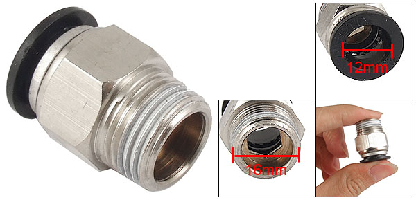 DetailsMale Thread 16mm x 12mm Quick Adapter Pneumatic Fitting  Item Name Pneumatic Fitting Total Size 28 x 24mm/1.1'' x 0.9'' (L*Max.D) Thread Diameter 16mm/0.63'' Fit Tube Outer Diameter 12mm/0.47'' Material Metal, Plastic Color Silver Tone, Black Weight 20g Package Content 1 x Pneumatic Fitting