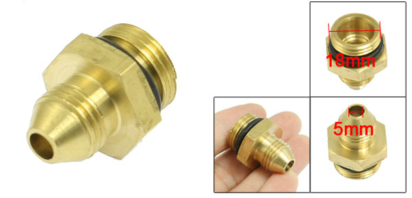 DetailsMale Threaded High Press Washer Brass Hose Adapter Gold Tone  Product Name Connector Thread Diameter 14mm, 18mm Tip Hole Diameter 5mm Overall Size 28.5 x 22mm/ 1.1" x 0.87" (L*W) Material Brass Color Gold Tone Net Weight 28g Package Content 1 x Connector