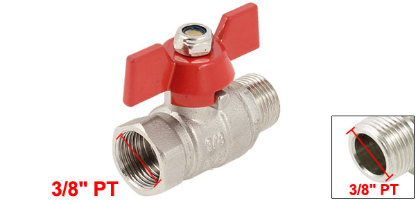 Product Name Ball Valve Type M/F Handle Size 47 x 22mm/1.9" x 0.87" (L*W) Body Size 48 x 23mm/1.9" x 0.9" (L*Max.D) Female Thread Size 3/8" PT Male to Female Material Brass, Metal Color Silver Tone, Red Net Weight 100g Package Content 1 x Ball Valve - Reviews